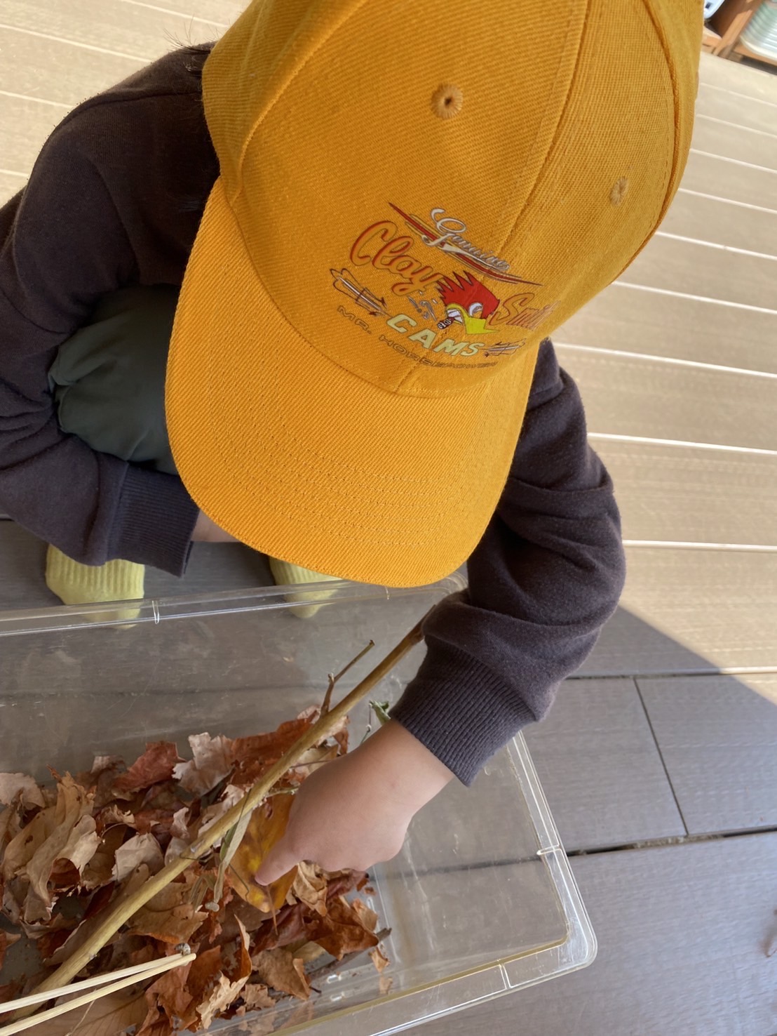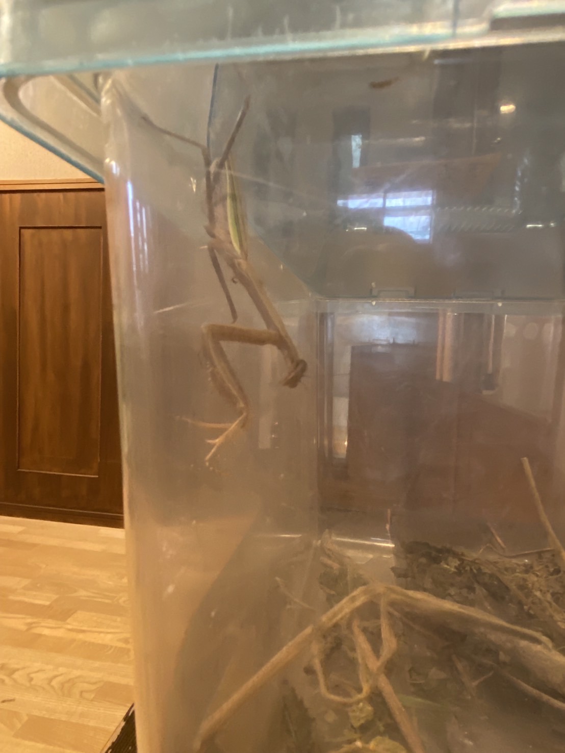 玄関先で見つけた一匹のかまきりに目を輝かせ、