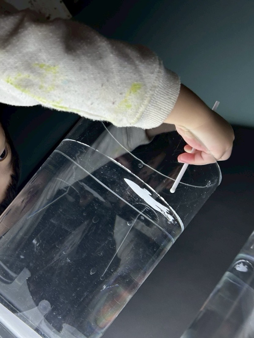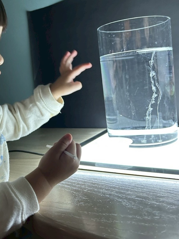 色の動きに着目した遊びの中で、子どもたちがより豊かに変化を感じ取れるよう、円柱の筒を用意しました