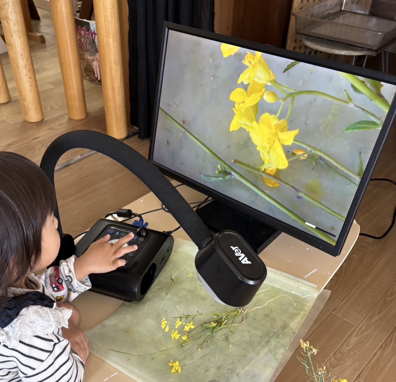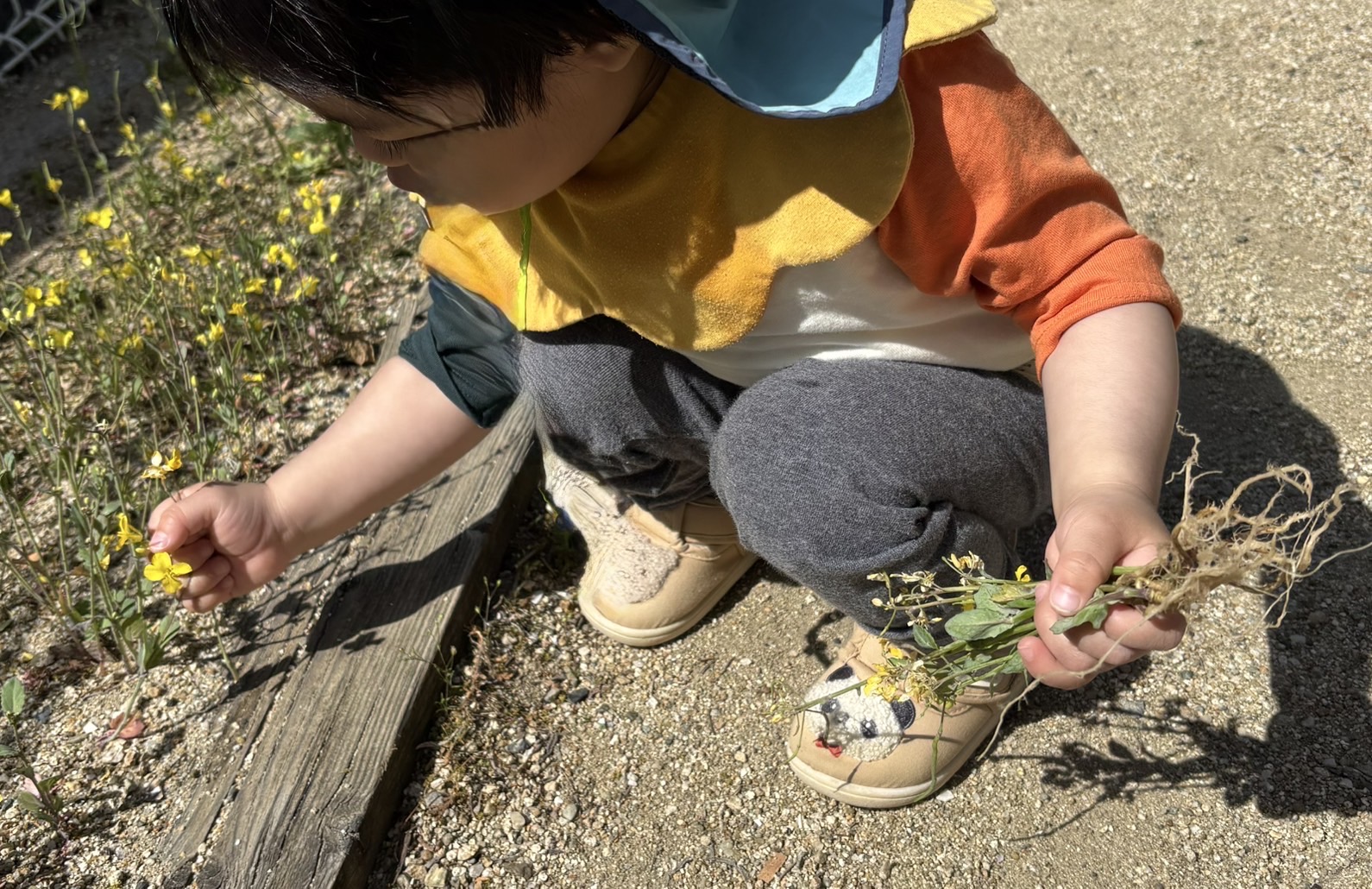 園庭に昨年種まきした菜の花がさき、発見したこどもが知らせてくれました