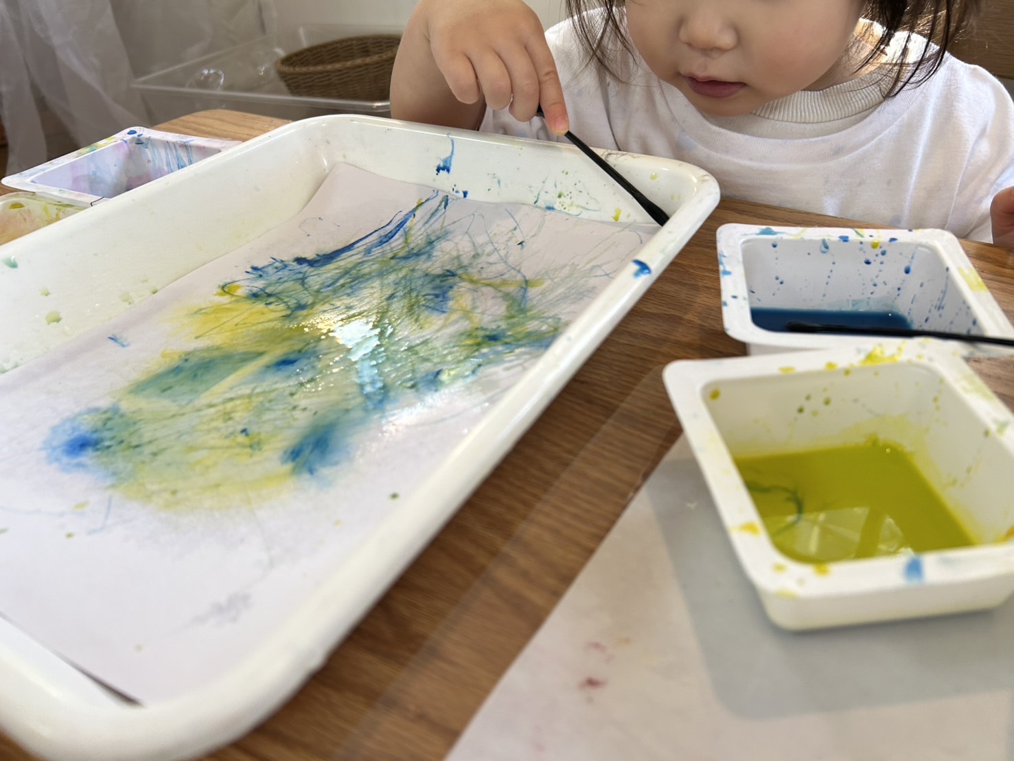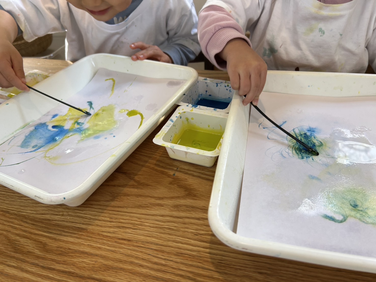 少しずつ色と出会い、色の混ざり合いを見てきた1.、2歳児